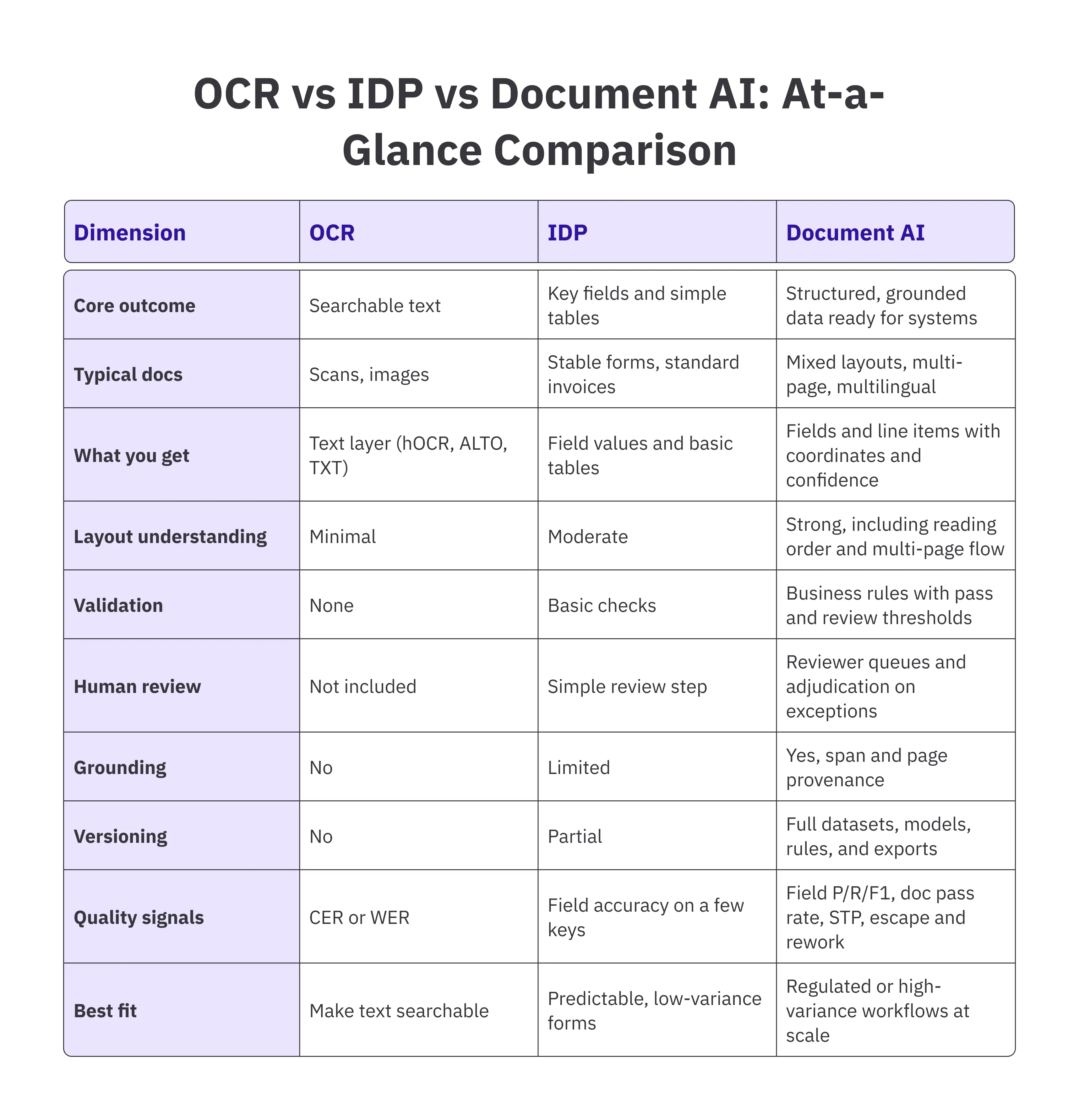 Here is a quick comparison table of OCR, IDP, and Document AI across the dimensions practitioners care about