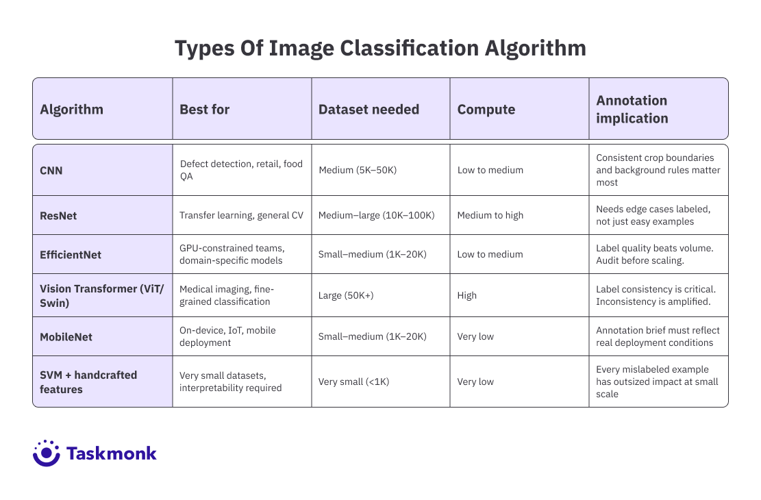 Picking an image classification algorithm is not just a model decision. It's an annotation strategy decision. CNN is the reliable default for most standard image tasks. ResNet is the go-to transfer learning backbone. EfficientNet gives you high accuracy with less data, as long as your labels are clean. Vision Transformers handle global pattern recognition but need large, consistent datasets. MobileNet is built for edge deployment. SVMs still have a place on very small datasets. This guide walks through each algorithm's strengths, compute requirements, and what each one demands from your labeled data, so you can align your annotation brief to your model choice before training starts, not after.