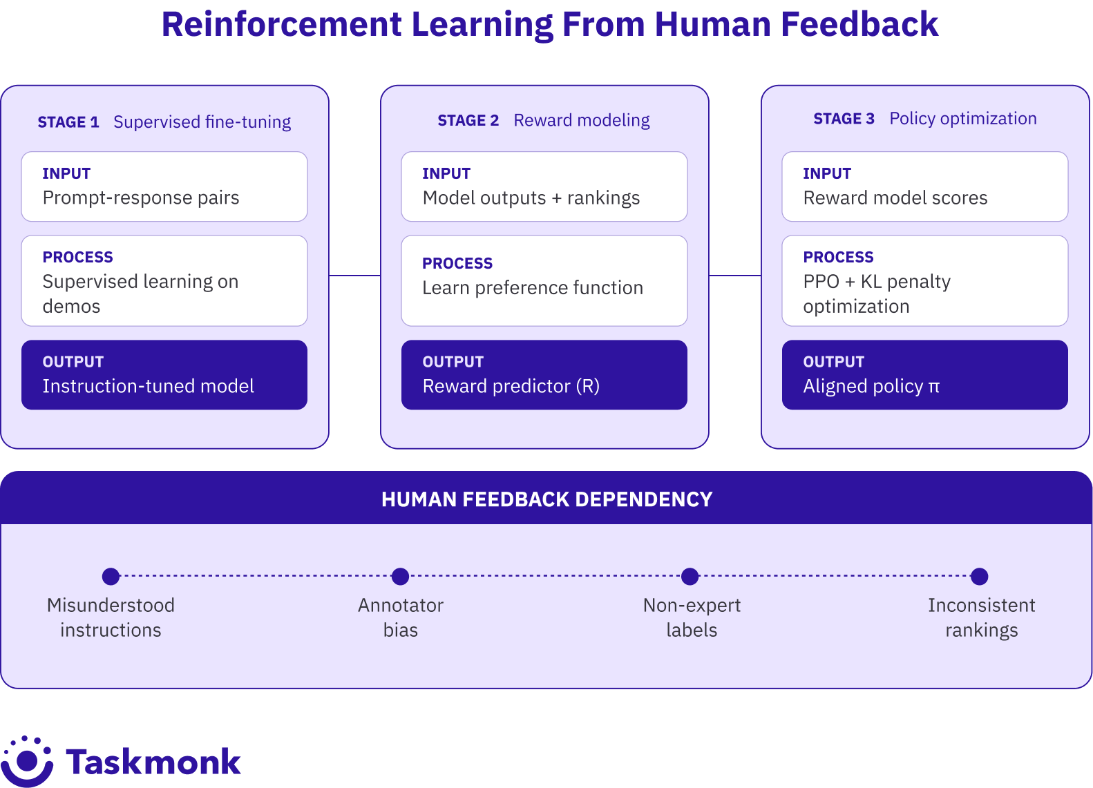 Each stage depends on human feedback collected at scale, and each introduces distinct quality-control challenges.
